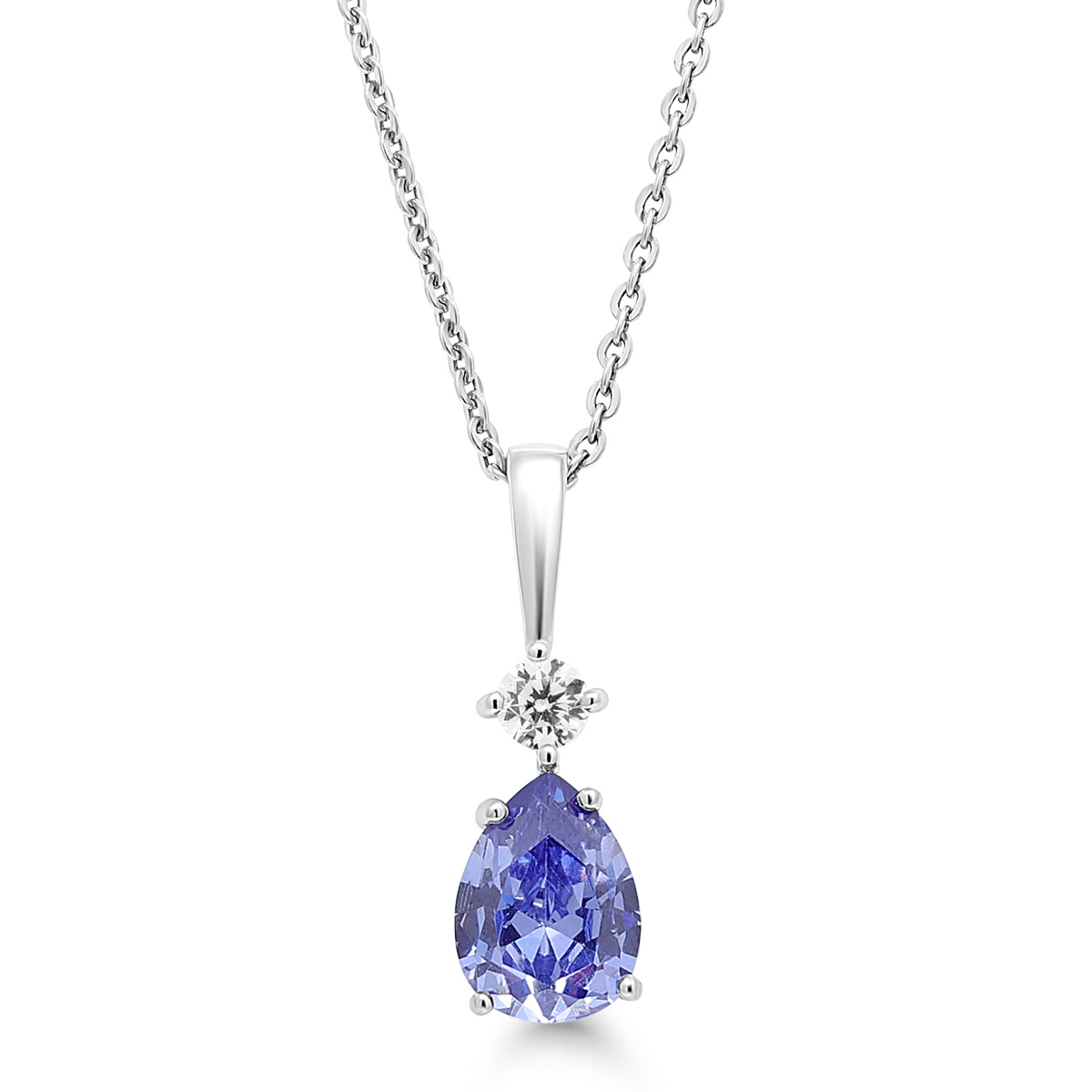 Beat of Love malliston hopeakaulakoru, josssa pisaran muotoinen laventelivärinen kivi ja päällä kirkas pyöreä zirkoni.