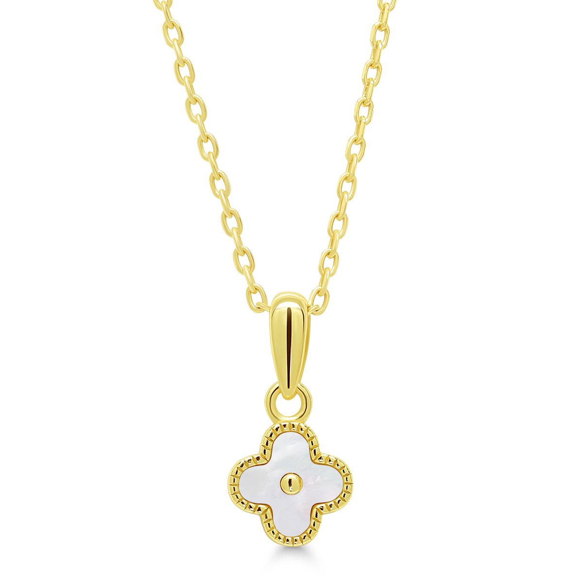 Kaunis kukkakaulakoru kullattua hopeaa helmiäiskoristeella.