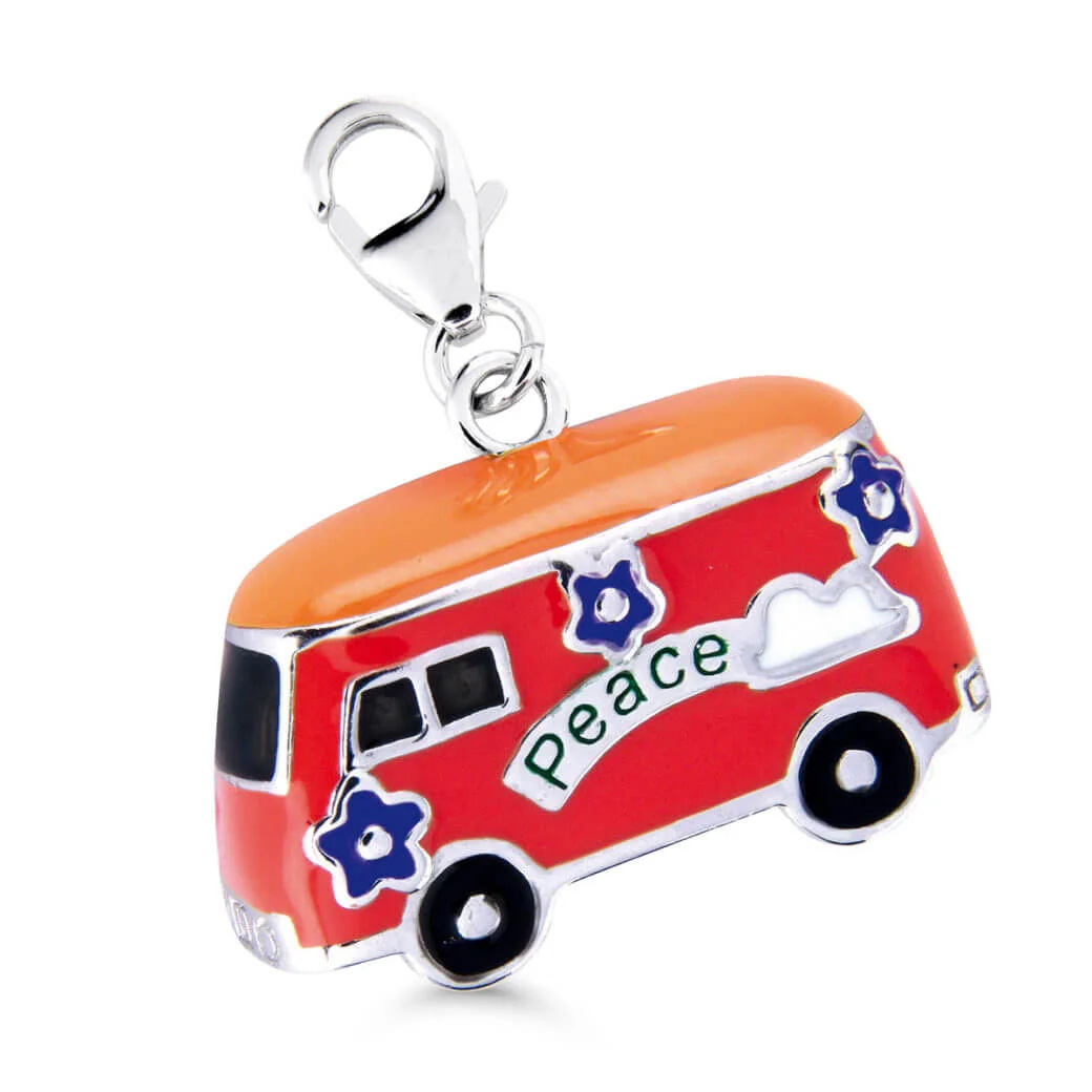 Charming Silver lukollinen oranssi-punainen emaloitu pakettiautomaskottiriipus. Tämä pakettiautu on kuin legendaarinen VW hippiauto Peace tekstillä sekä kukka ja pilvi koristeilla. Ripusta tämä kaunis hopeinen maskotti rannekoruusi, kaulakoruusi tai vaikka laukkusi vetoketjuun.