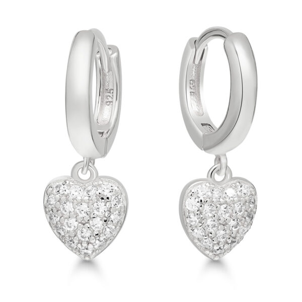 Hopeakorvakorut, joista roikkuvat kauniisti zirkoneilla koristellut sydämet.