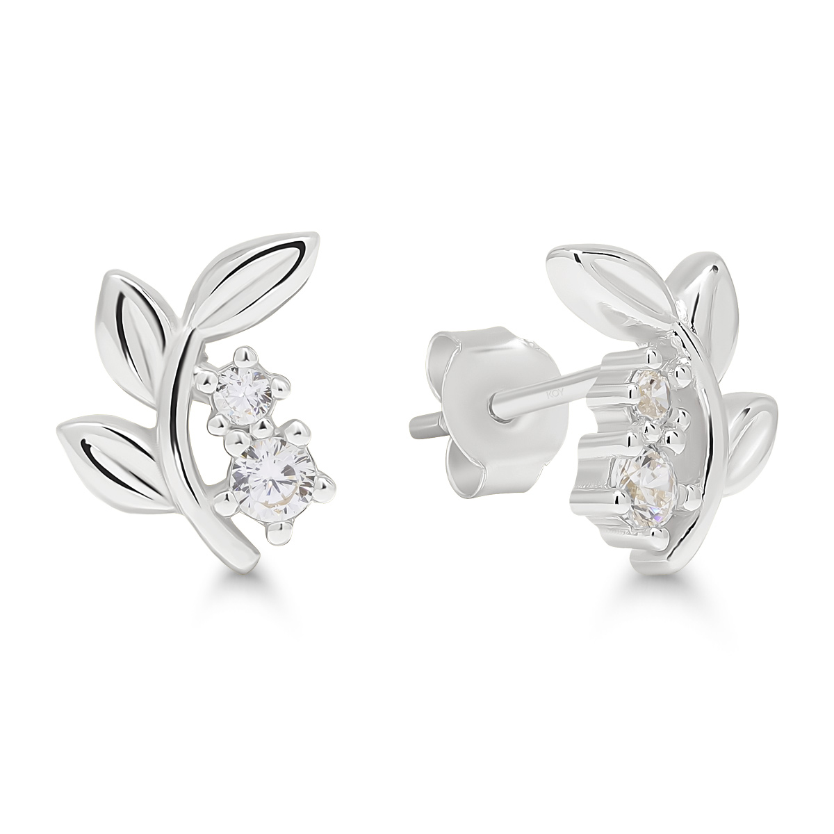 Lehtikorvakorut kirkkailla zirkoneilla rodinoitua hopeaa.