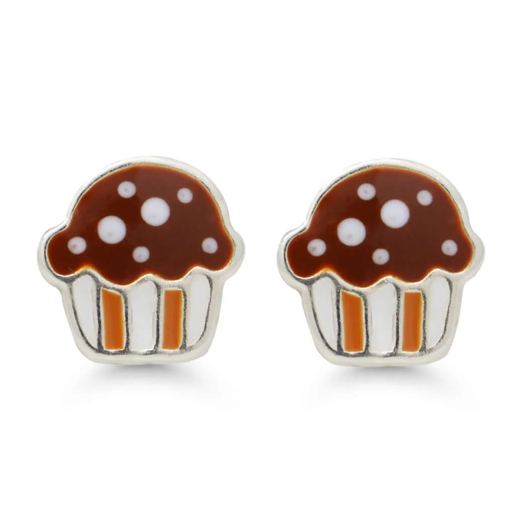 Ruskea muffinssi korvakorut emaloitua hopeaa.