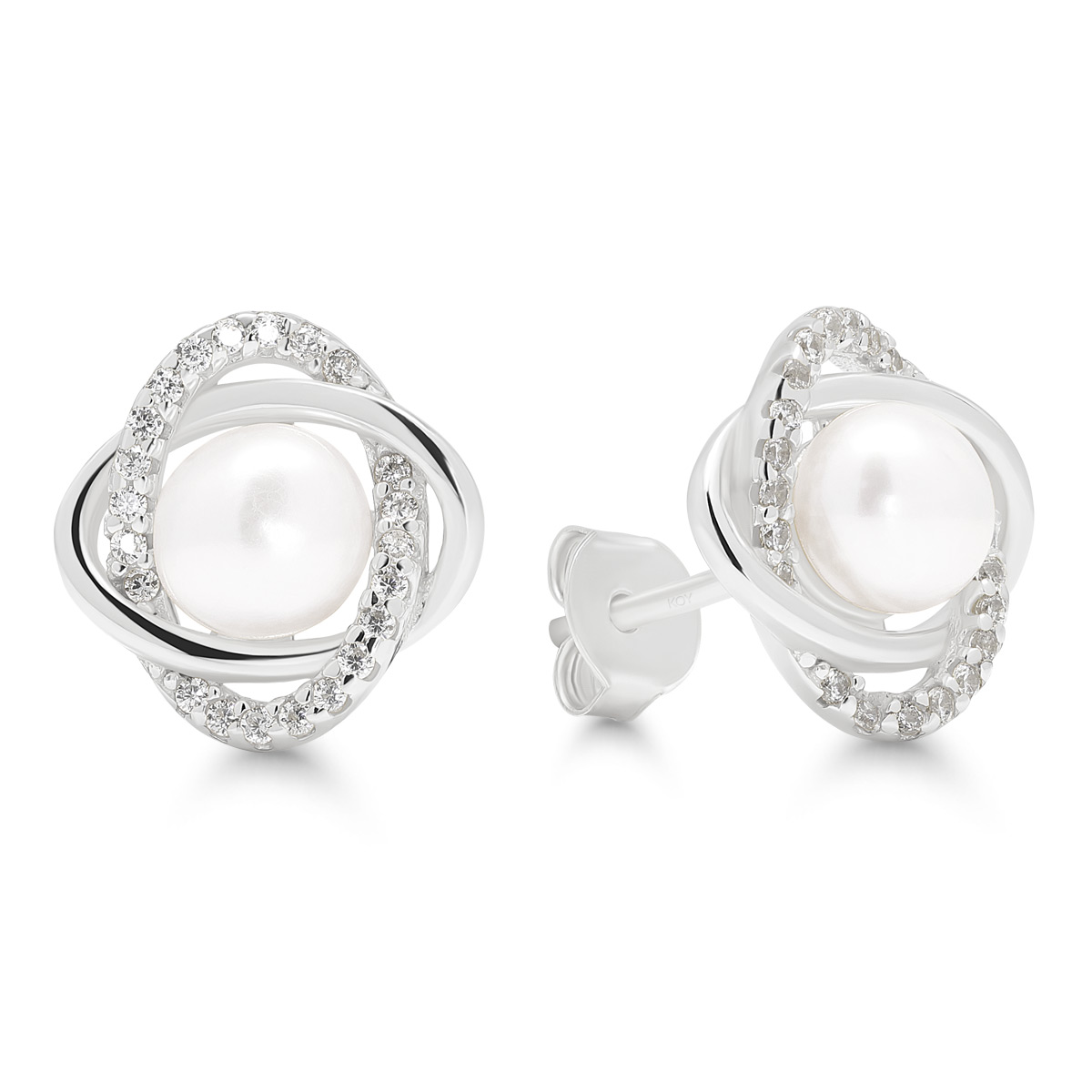 Hopeakorvakorut synteettisillä zirkoneilla ja aidoilla makean veden helmillä.