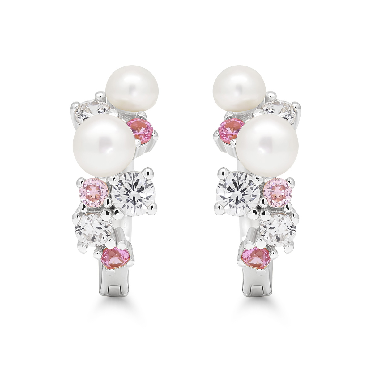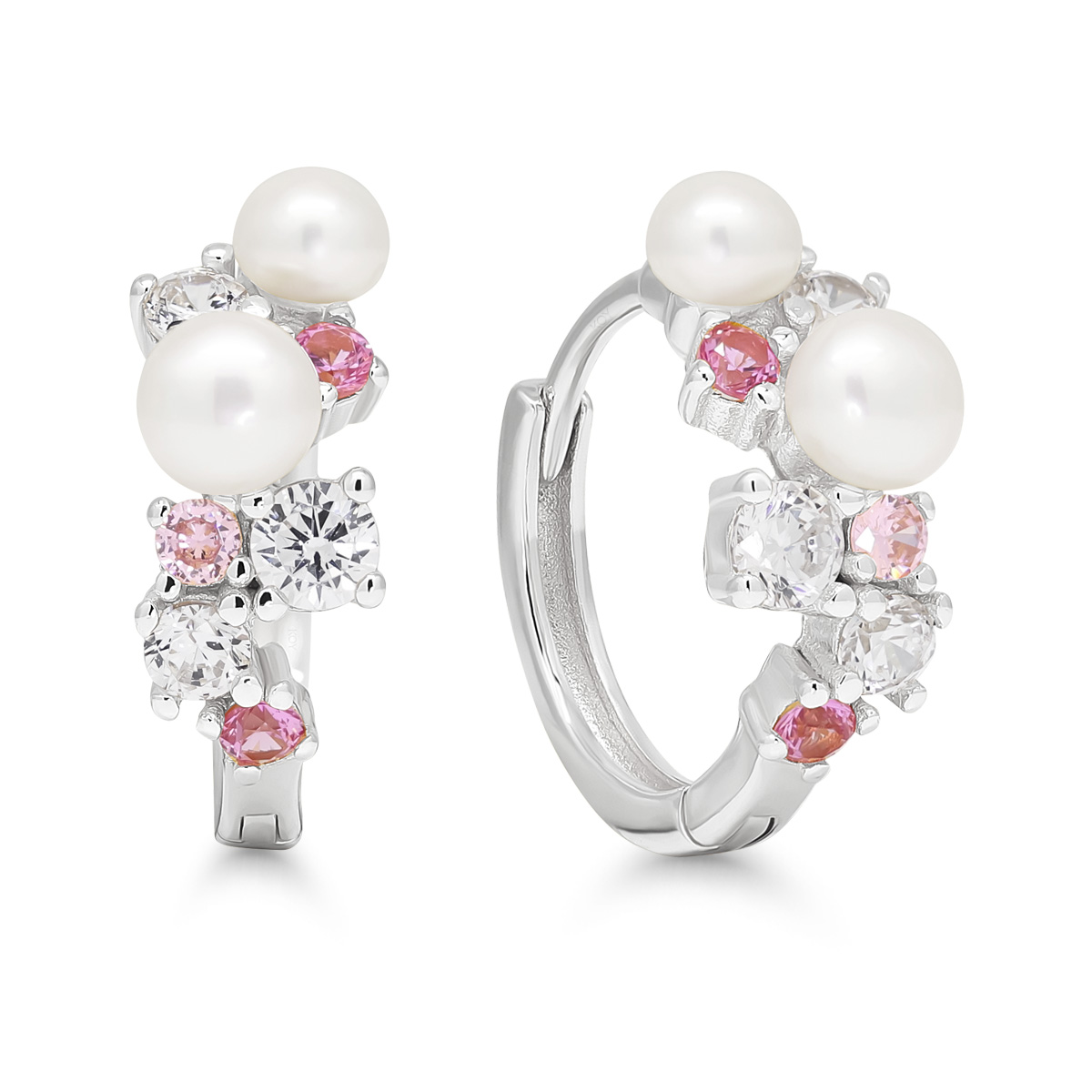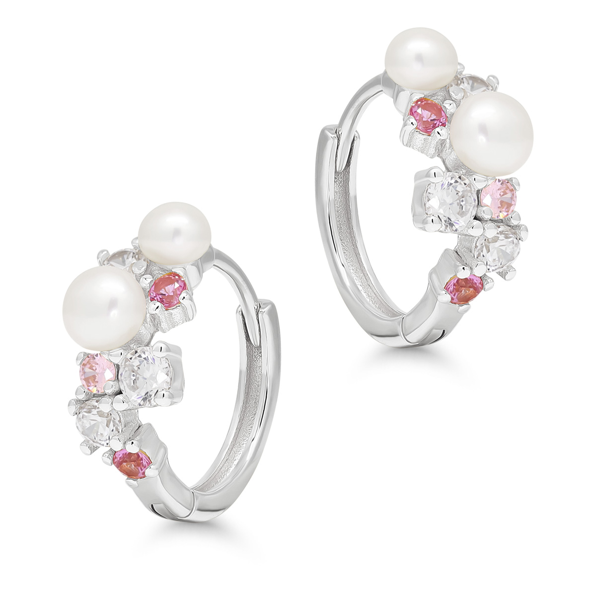 Saranalliset hopeakorvarenkaat pinkeillä ja kirkkailla zirkoneilla, sekä helmillä