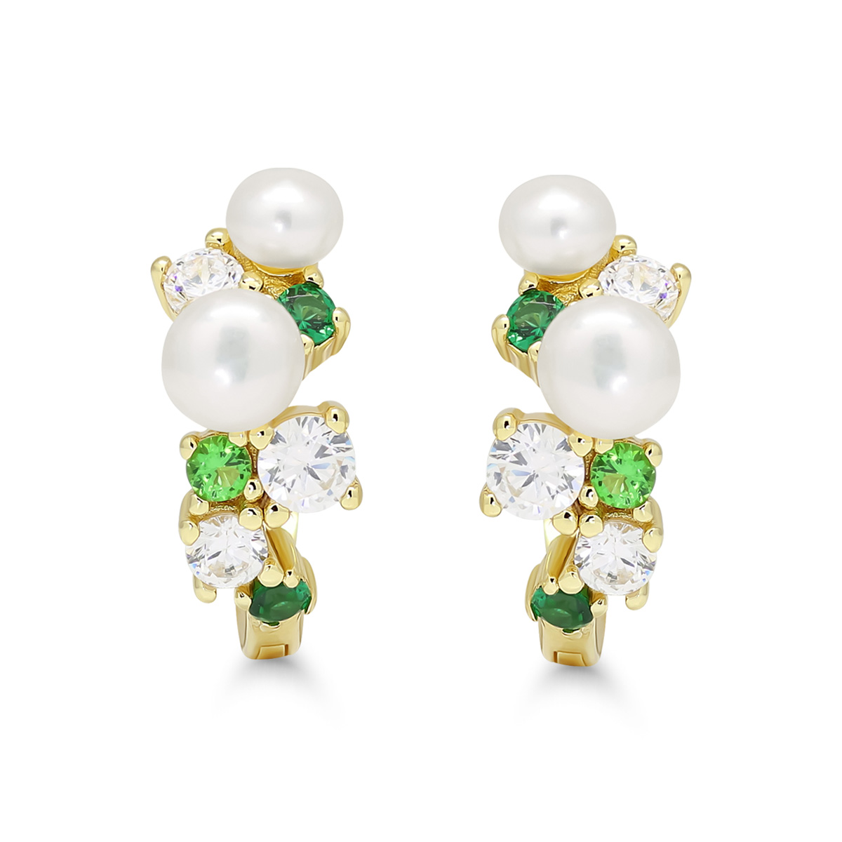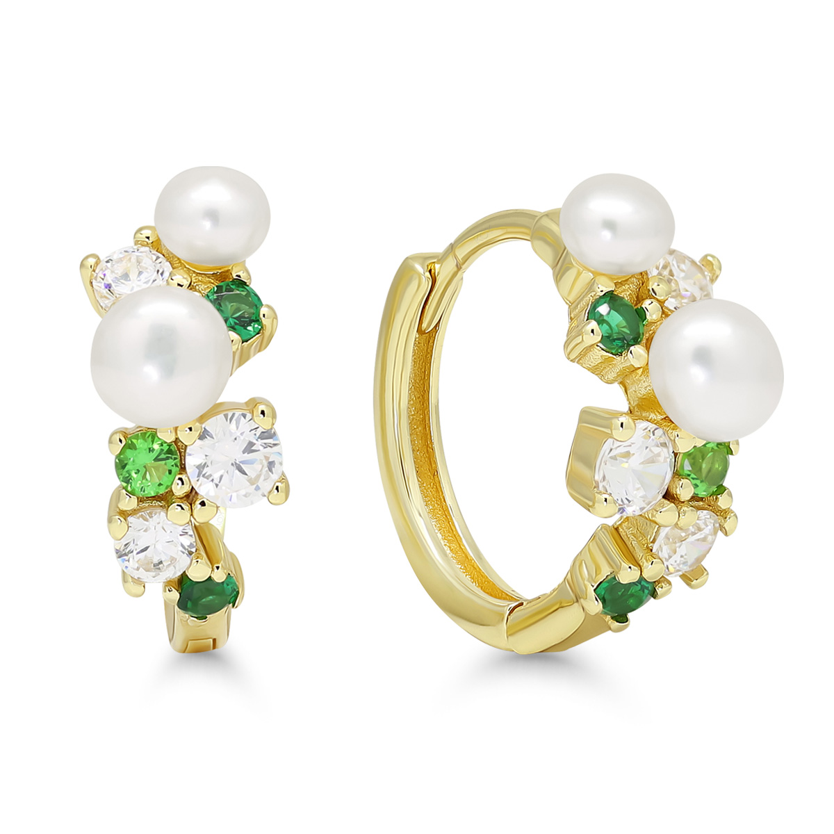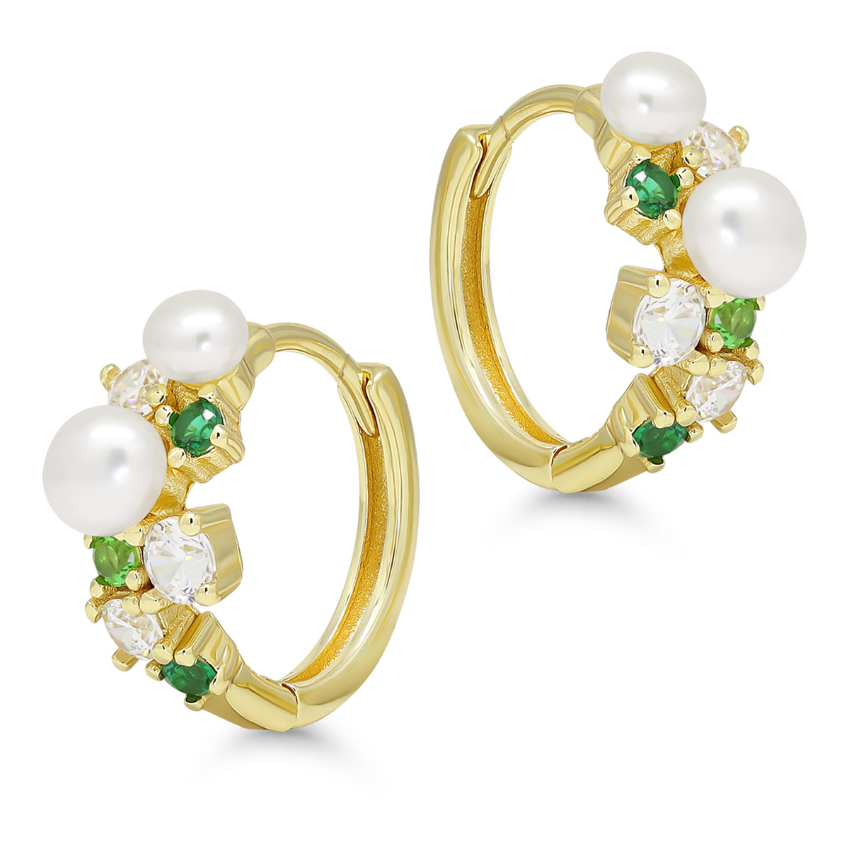 Saranalliset hopeakorvarenkaat vihreillä ja kirkkailla zirkoneilla, sekä helmillä. Kullattu