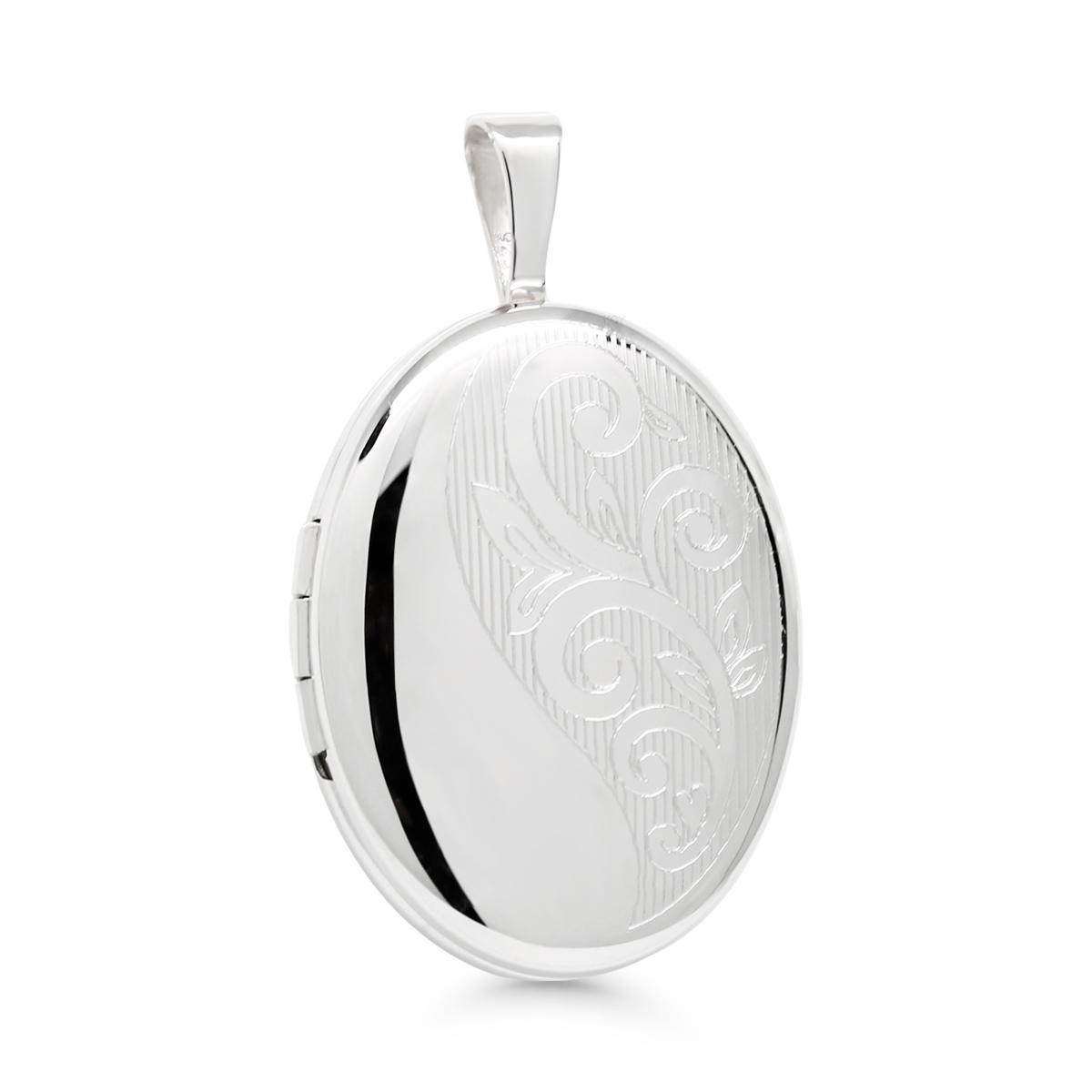 Hopeinen ovaalin muotoinen medaljonki köynnöskaiverruksella, tilaa kahdelle kuvalle.