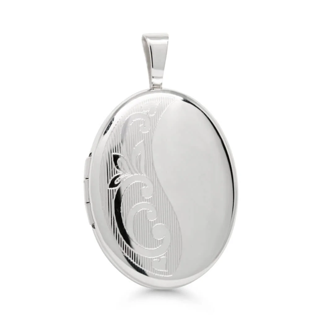 Hopeinen ovaalin muotoinen medaljonki köynnöskaiverruksella, tilaa kahdelle kuvalle.
