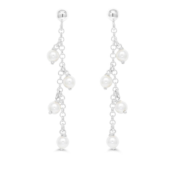 Tyylikkäät ja naiselliset kullatut hopea nappikorvakorut roikkuvilla ketjuilla. Valkoiset 4mm synteettiset helmet. Sopii jokapäiväiseen käyttöön.