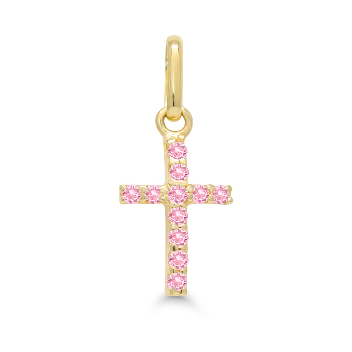 Kaunis ja klassinen keltakultainen 12,5mm risti riipus pinkkilla zirkoneilla.