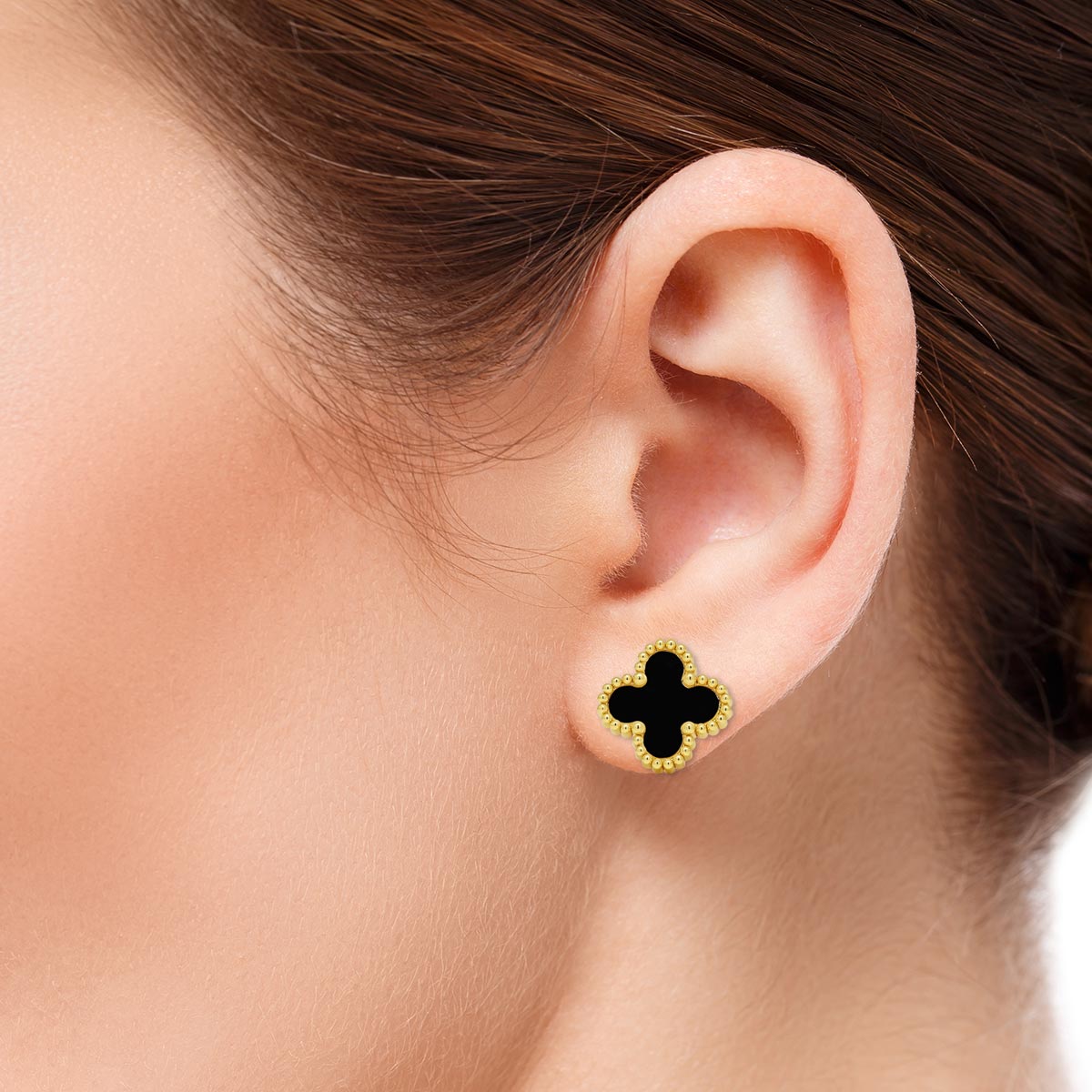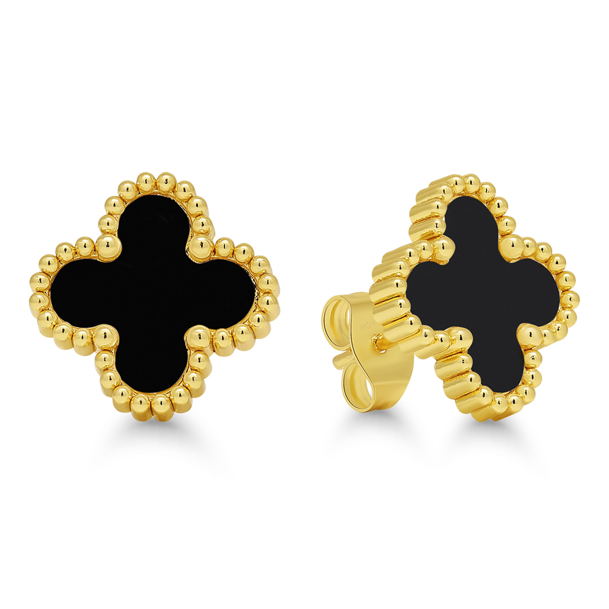 Kauniit kukkakorvakorut kullattua terästä mustalla koristeella.