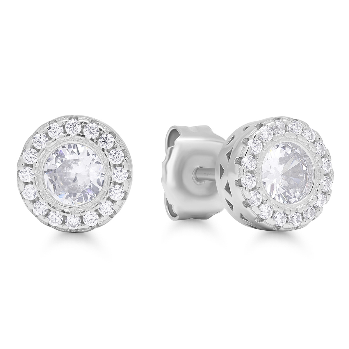 Pyöreät litteät laattamalliset hopeakorvakorut täynnä zirkoneita.