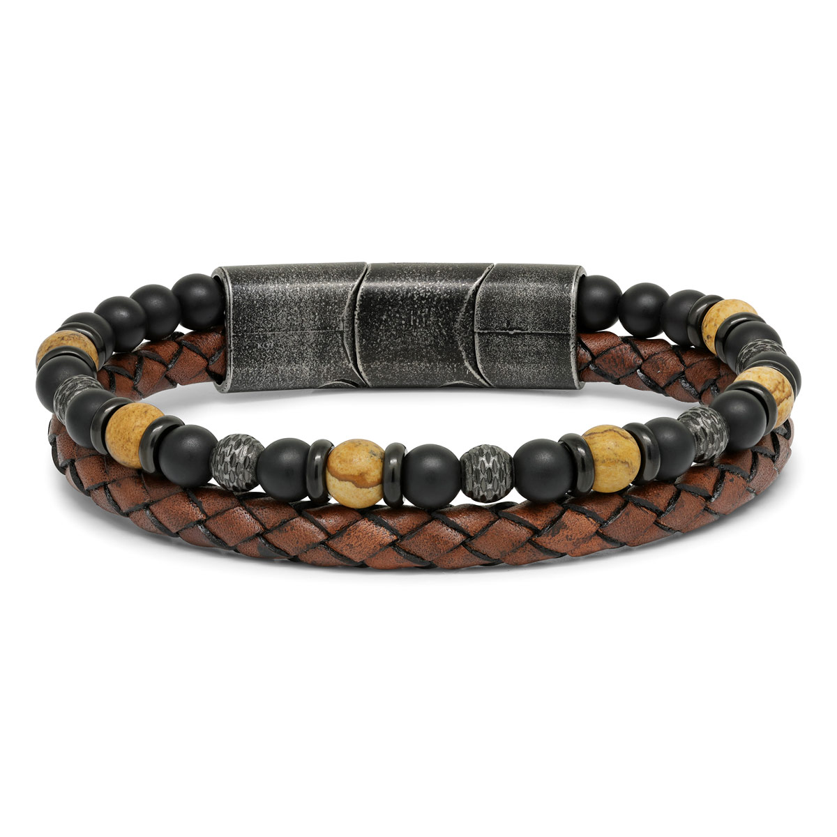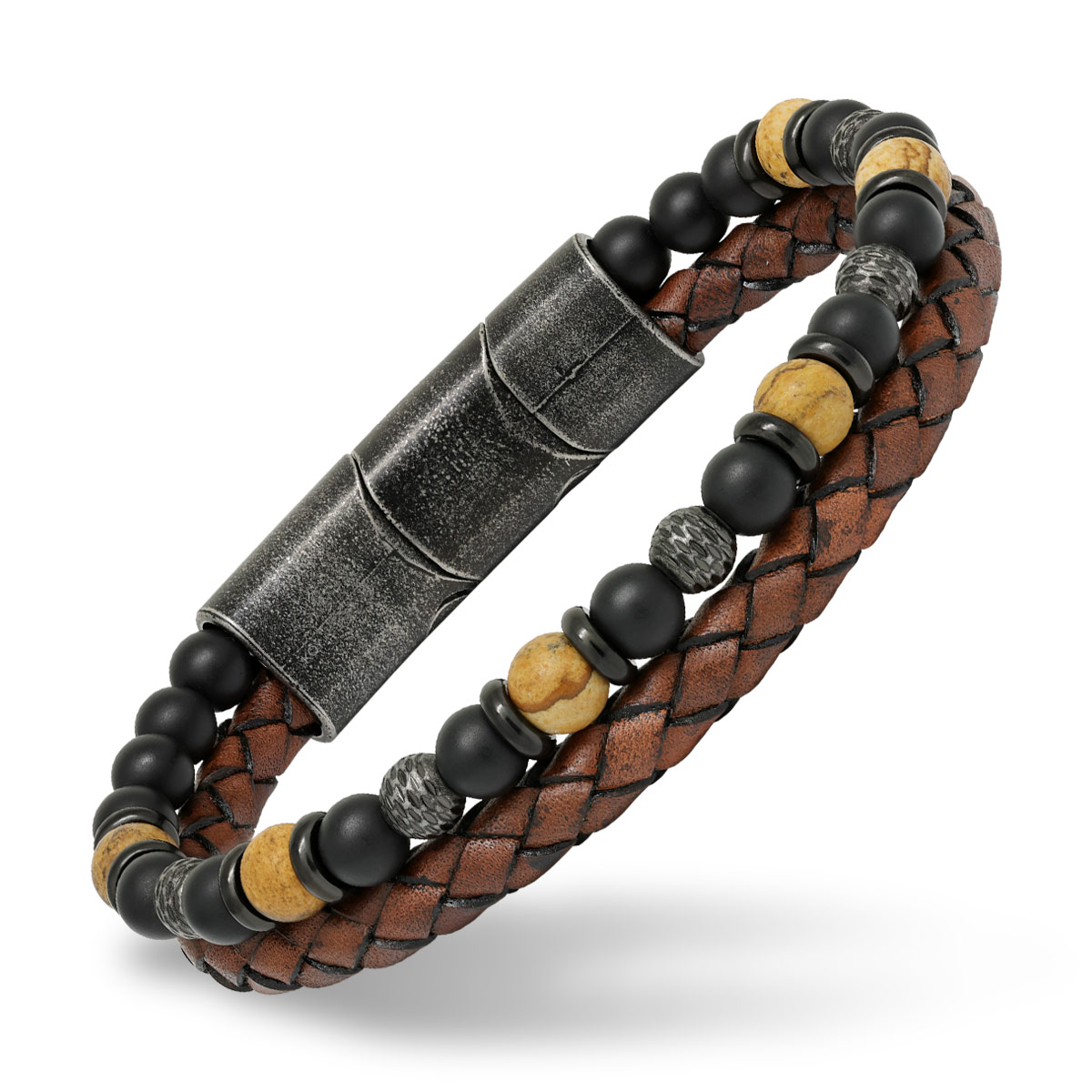 Ruskea rannekoru nahkaa ja terästä akaatilla ja japsiksilla