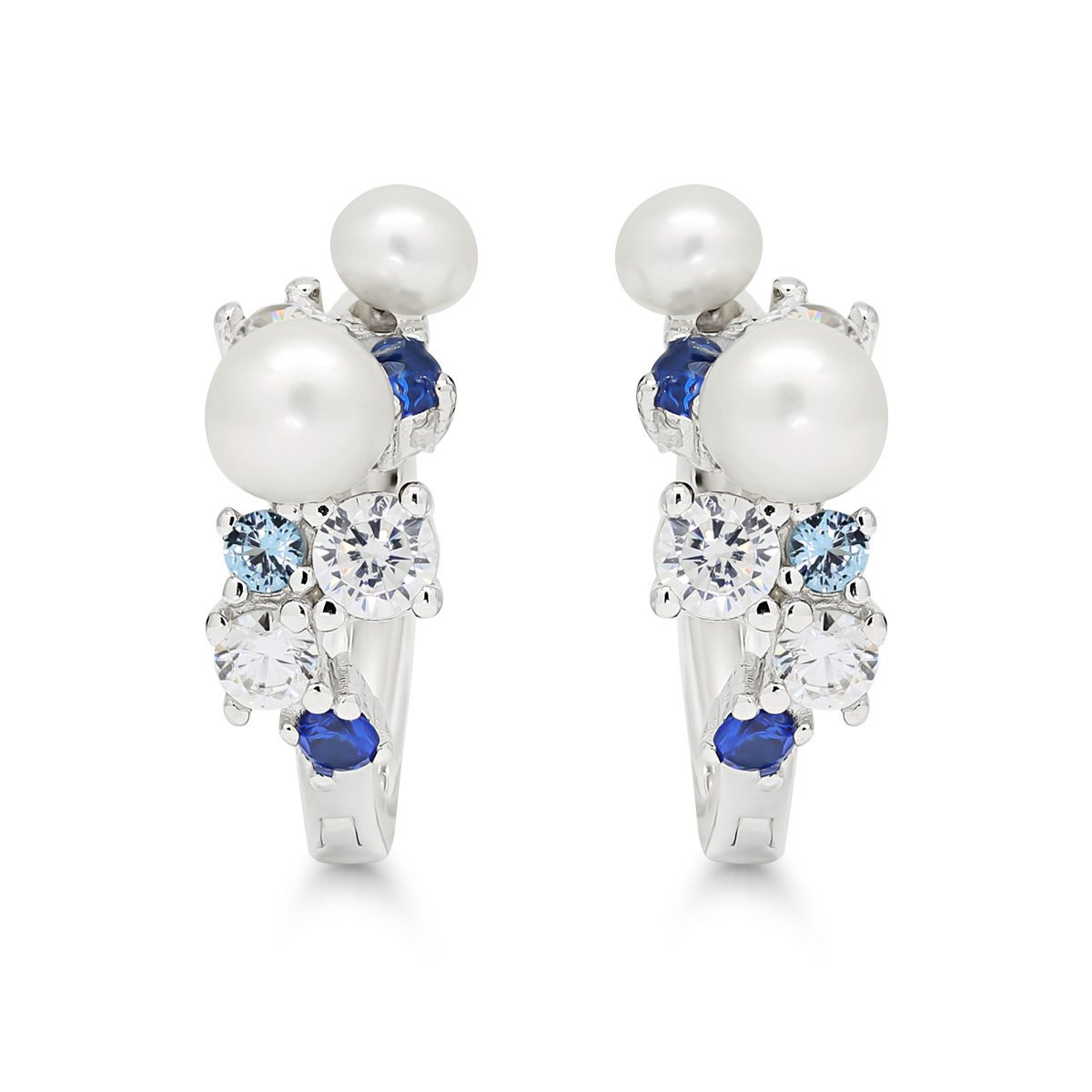 Saranalliset hopeakorvarenkaat sinisillä zirkoneilla ja helmillä