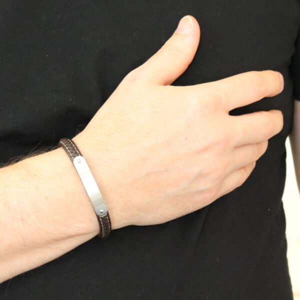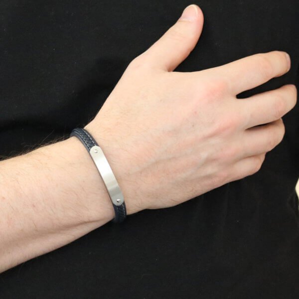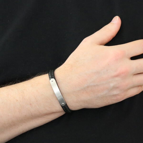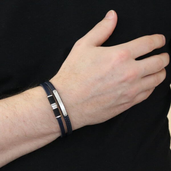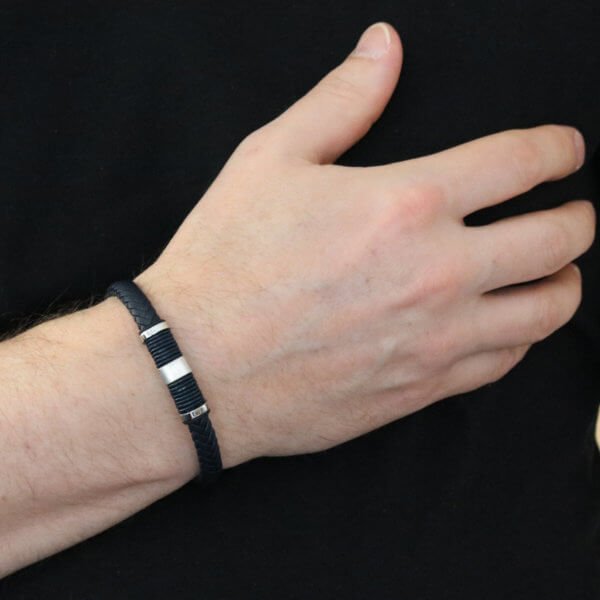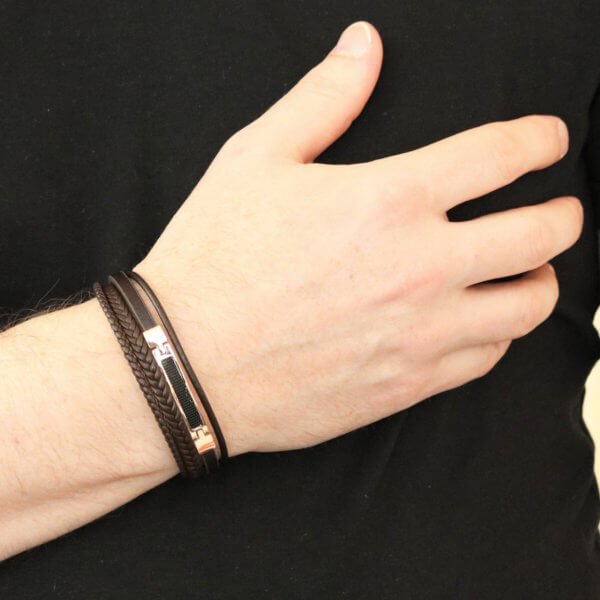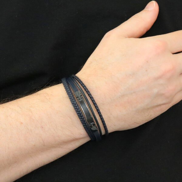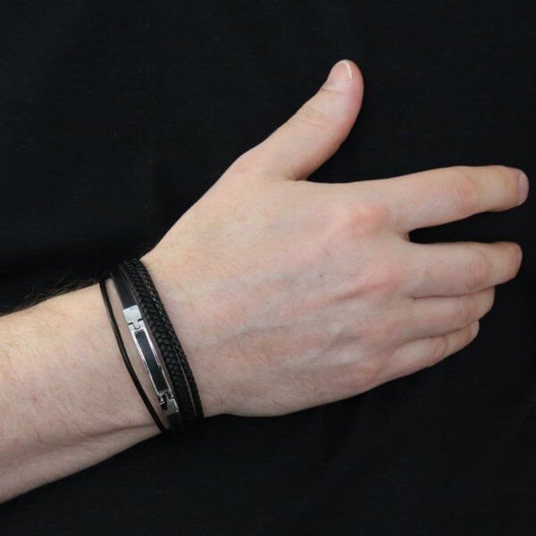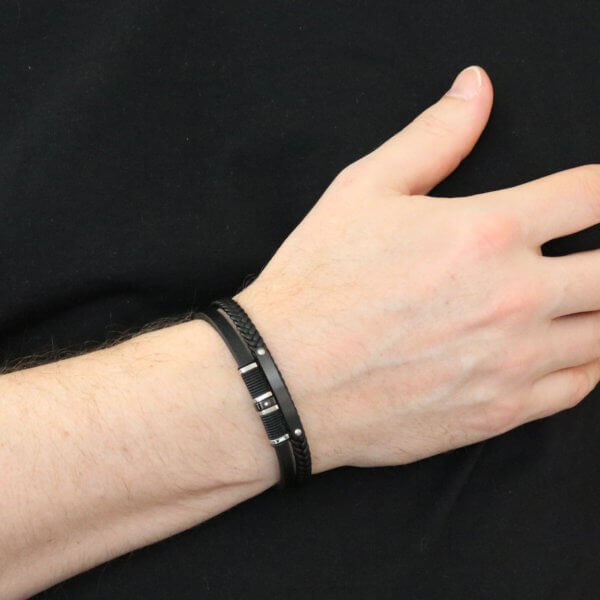 Miesten tyylikäs kolmiosainen, musta nahkarannekoru mustilla teräskoristeilla ja lukolla.