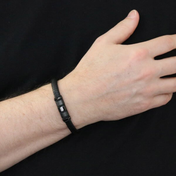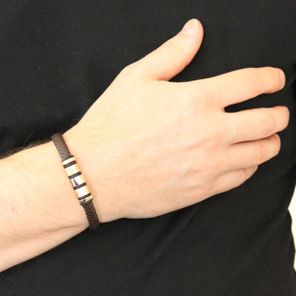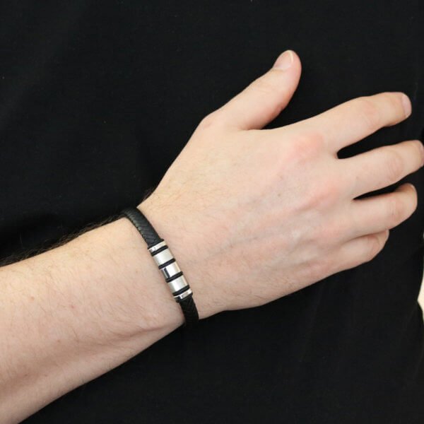 Miesten tyylikäs sininen nahkaranneke teräspaloilla ja lukolla.